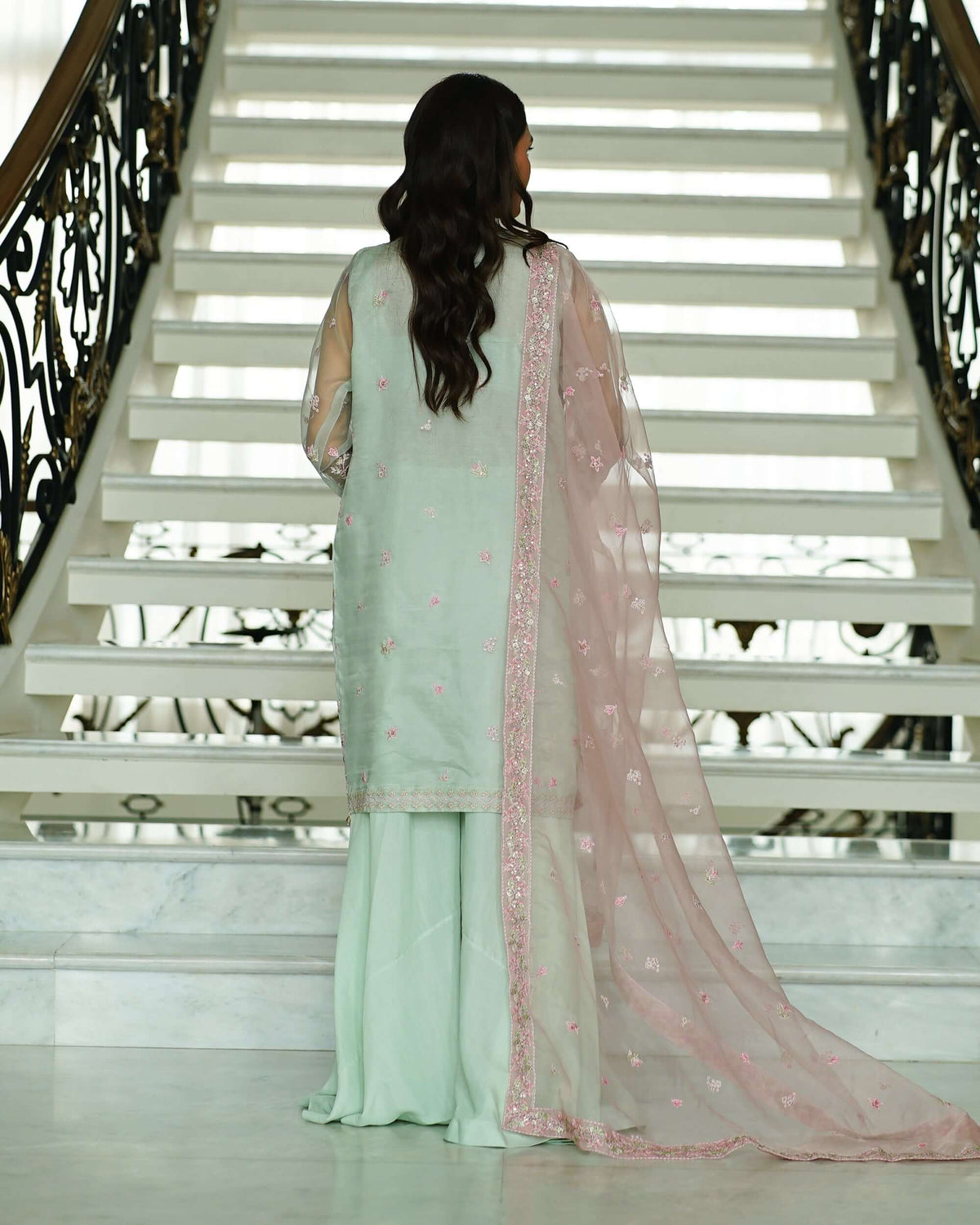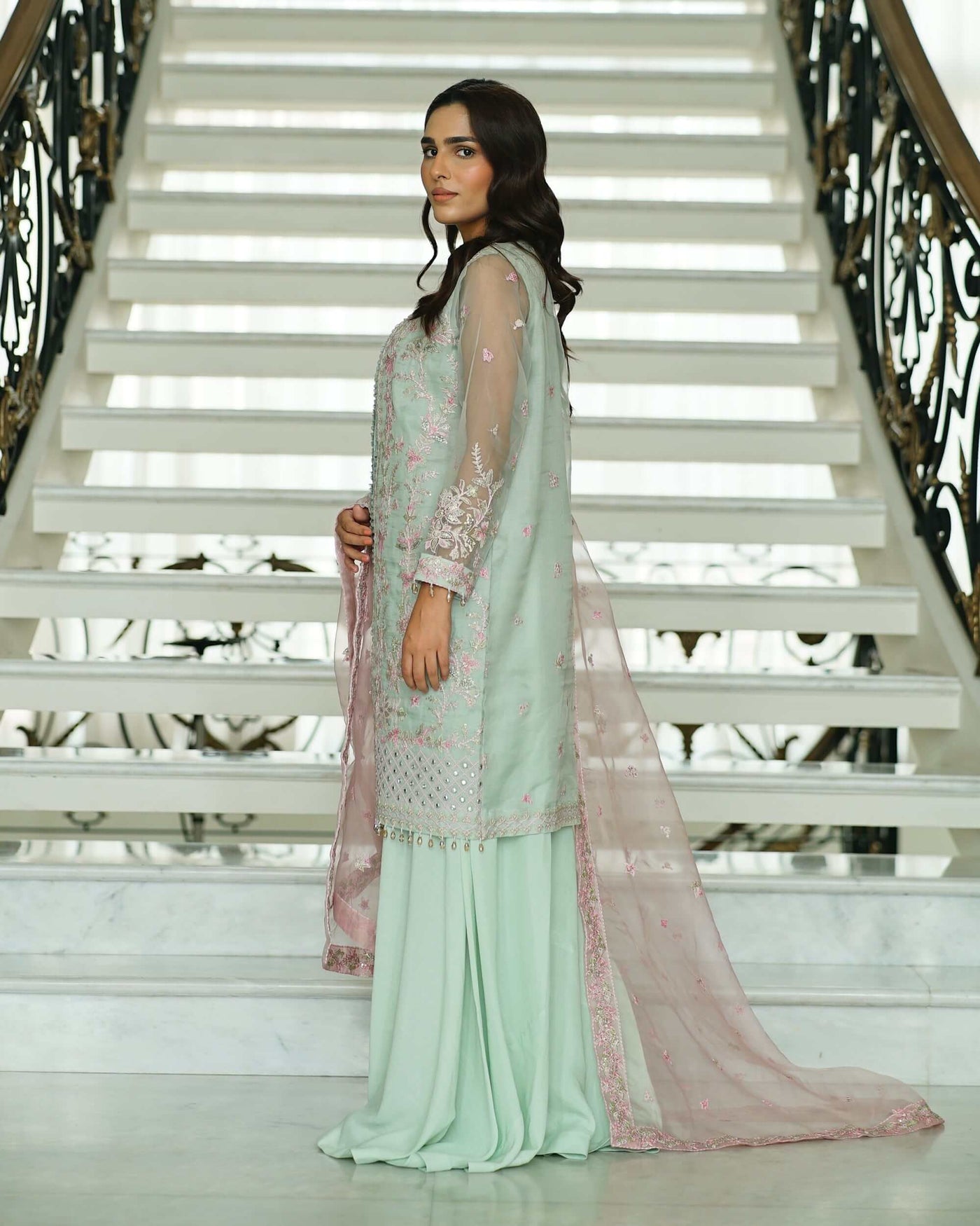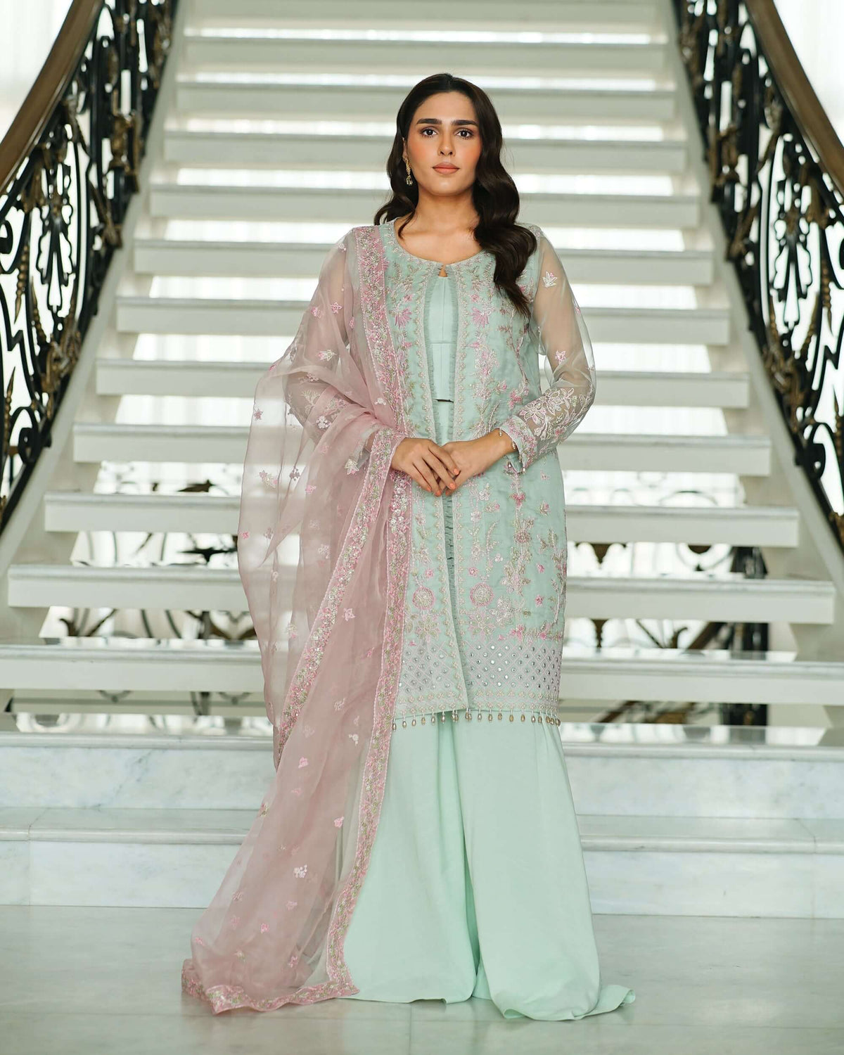 The Mina ensemble tells a tale of charm and celebration, adorned with exquisite pink, green, and golden tilla embroidery that shimmers delicately with sequins across the soft mint green canvas. Each stitch breathes life into the fabric, creating a symphony of elegance and festivity. The contrasting pink dupatta, ethereal and graceful, adds a pop of vibrance, perfectly balancing the outfit’s refined allure. Paired with matching raw silk trousers, this ensemble is a vision of timeless beauty—crafted for moments that deserve to be cherished forever.