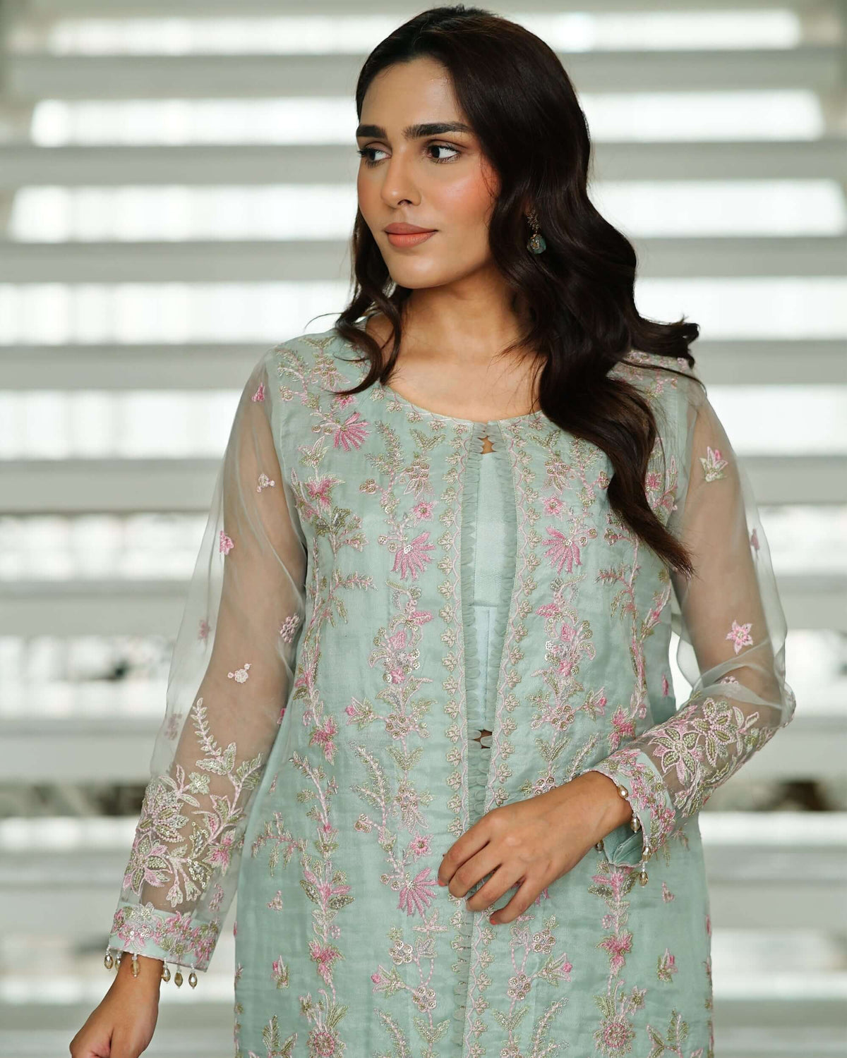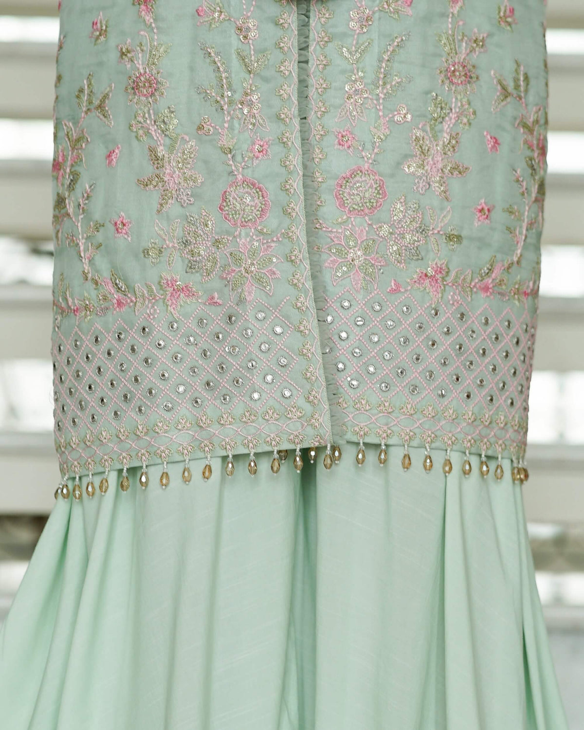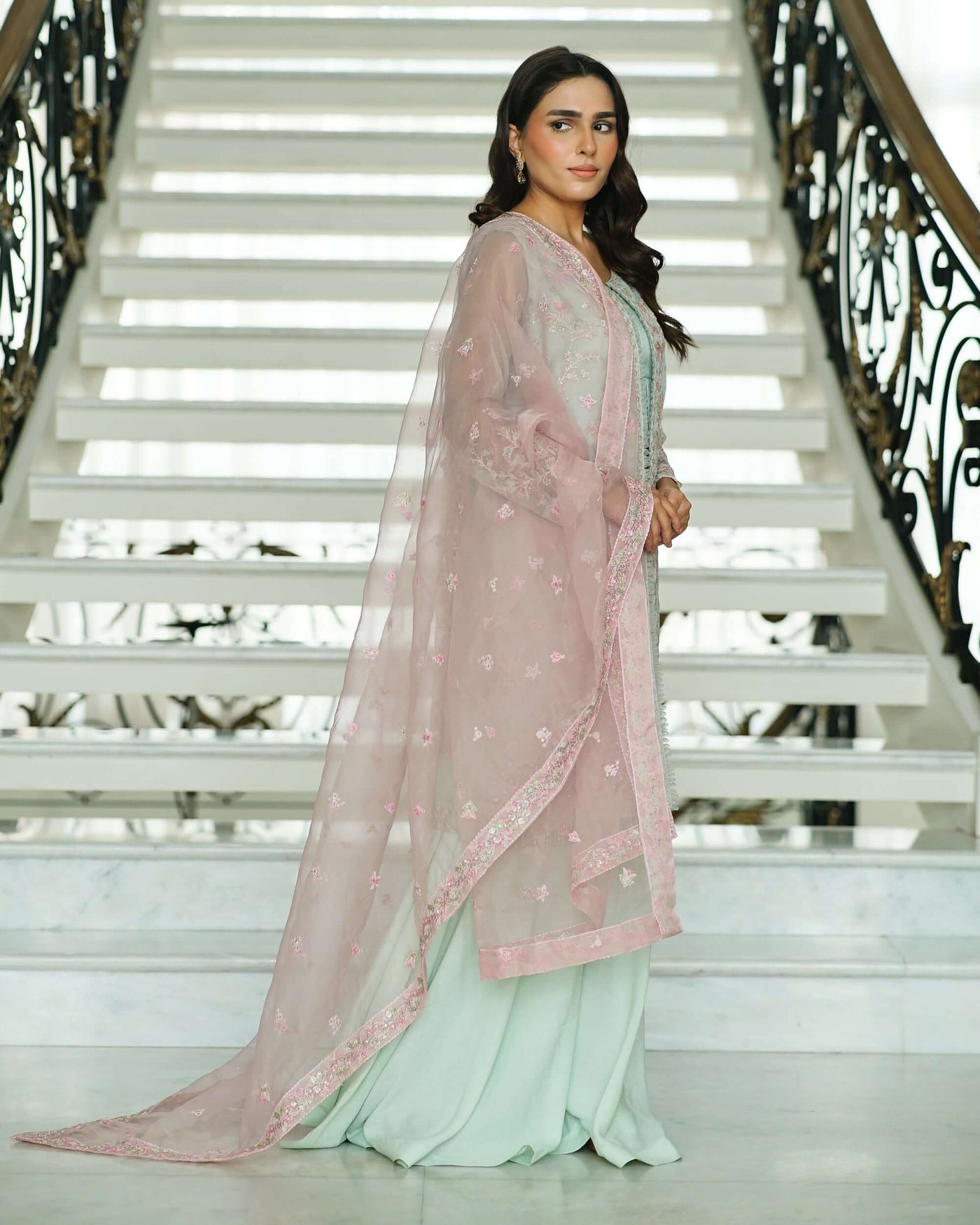 The Mina ensemble tells a tale of charm and celebration, adorned with exquisite pink, green, and golden tilla embroidery that shimmers delicately with sequins across the soft mint green canvas. Each stitch breathes life into the fabric, creating a symphony of elegance and festivity. The contrasting pink dupatta, ethereal and graceful, adds a pop of vibrance, perfectly balancing the outfit’s refined allure. Paired with matching raw silk trousers, this ensemble is a vision of timeless beauty—crafted for moments that deserve to be cherished forever.