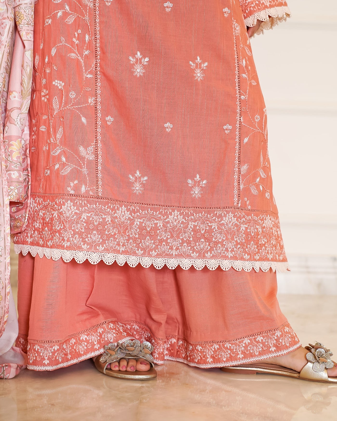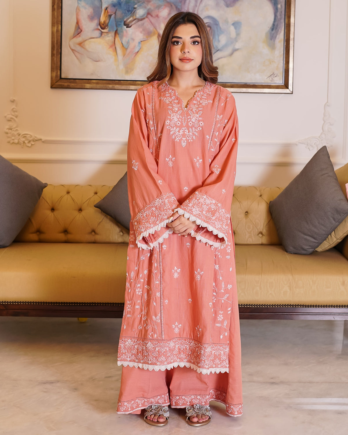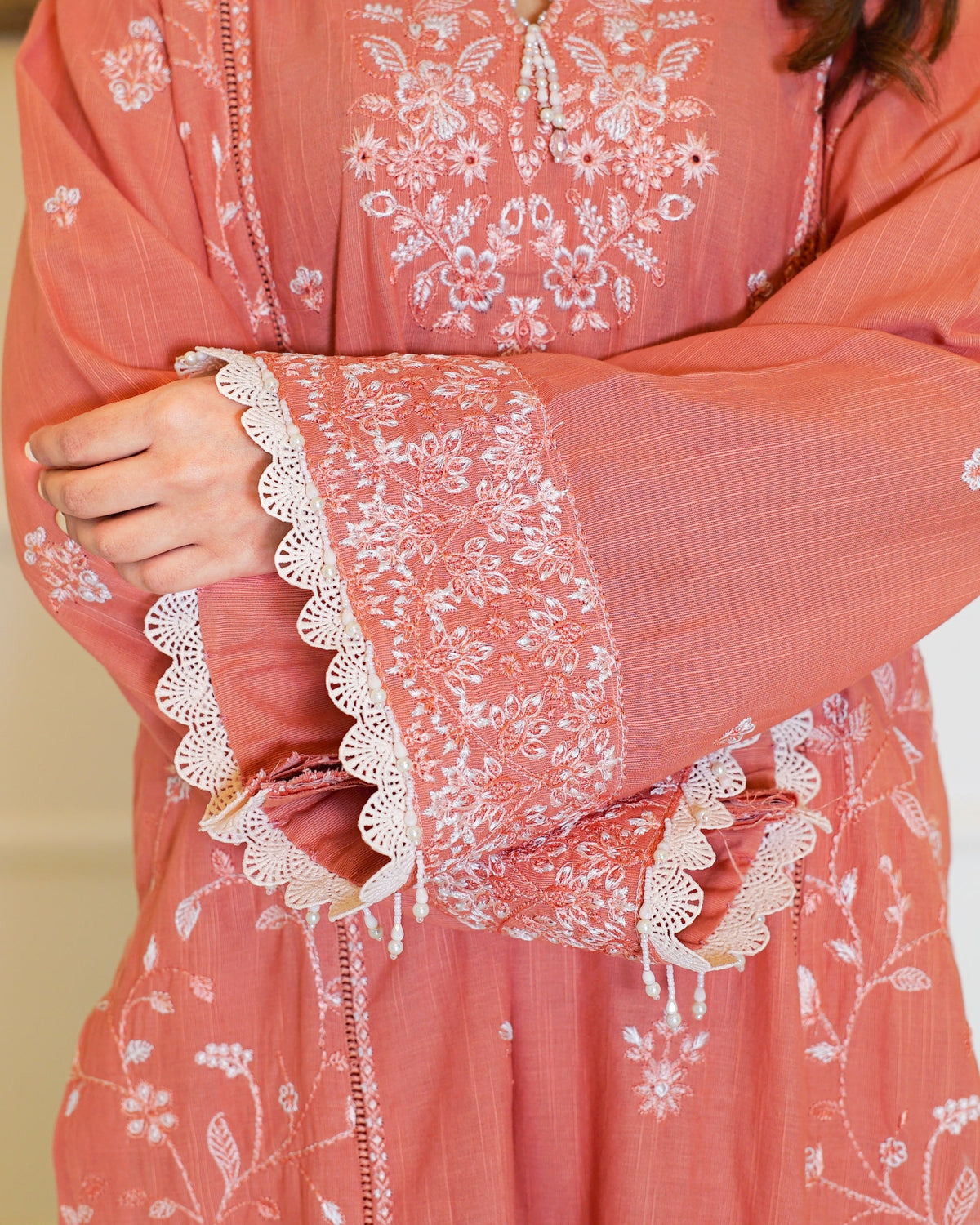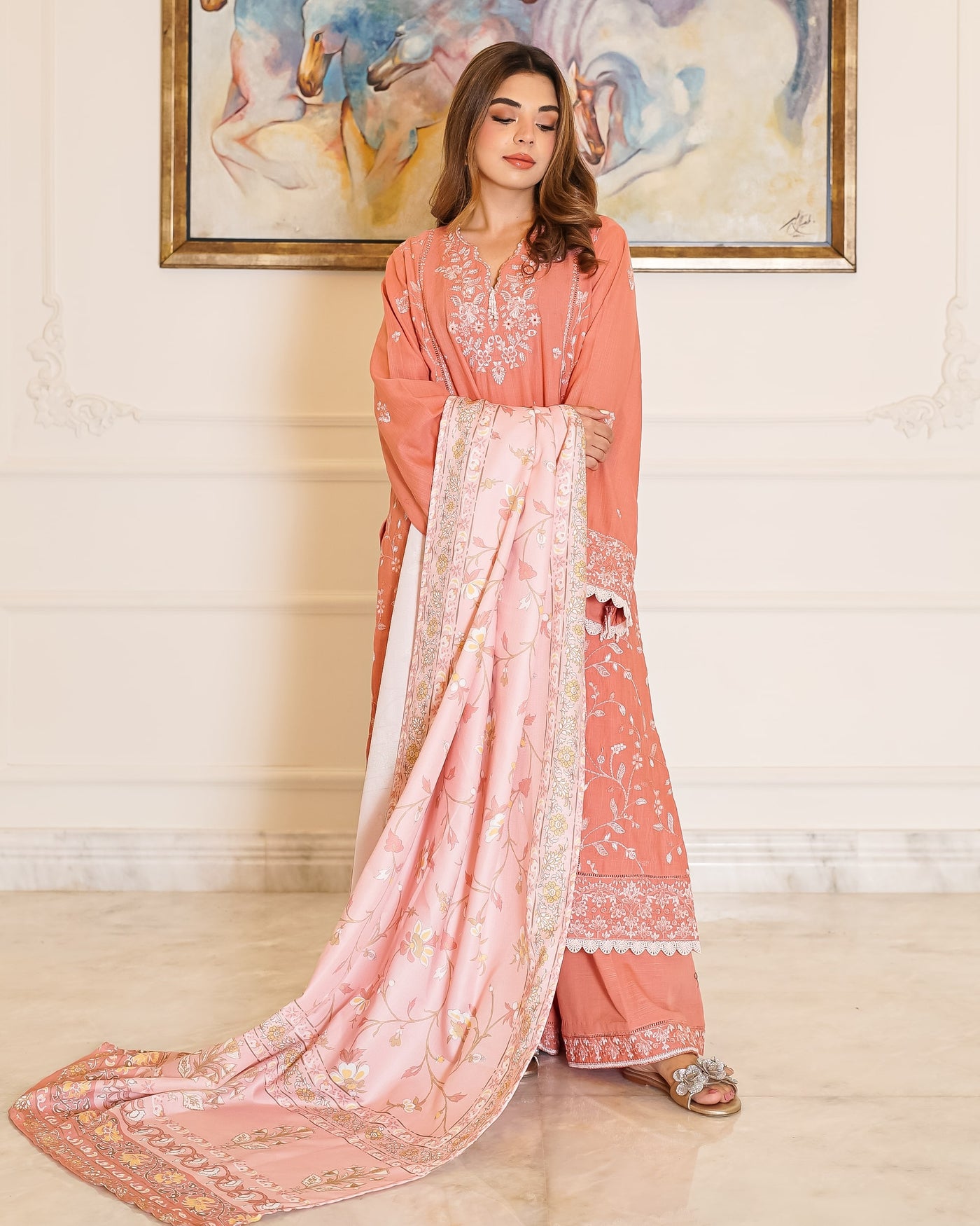 Elevate your winter wardrobe with this elegant dusty peach khaddar outfit, adorned with delicate white embroidery that brings a soft, graceful charm to your look. The shirt features intricate floral embroidery on the neckline, front panels and sleeves. The thick khaddar fabric ensures warmth and comfort, making it ideal for colder days. Paired with matching khaddar trousers and a cozy wool shawl, this ensemble blends seasonal practicality with timeless sophistication—perfect for both casual gatherings and festive occasions.