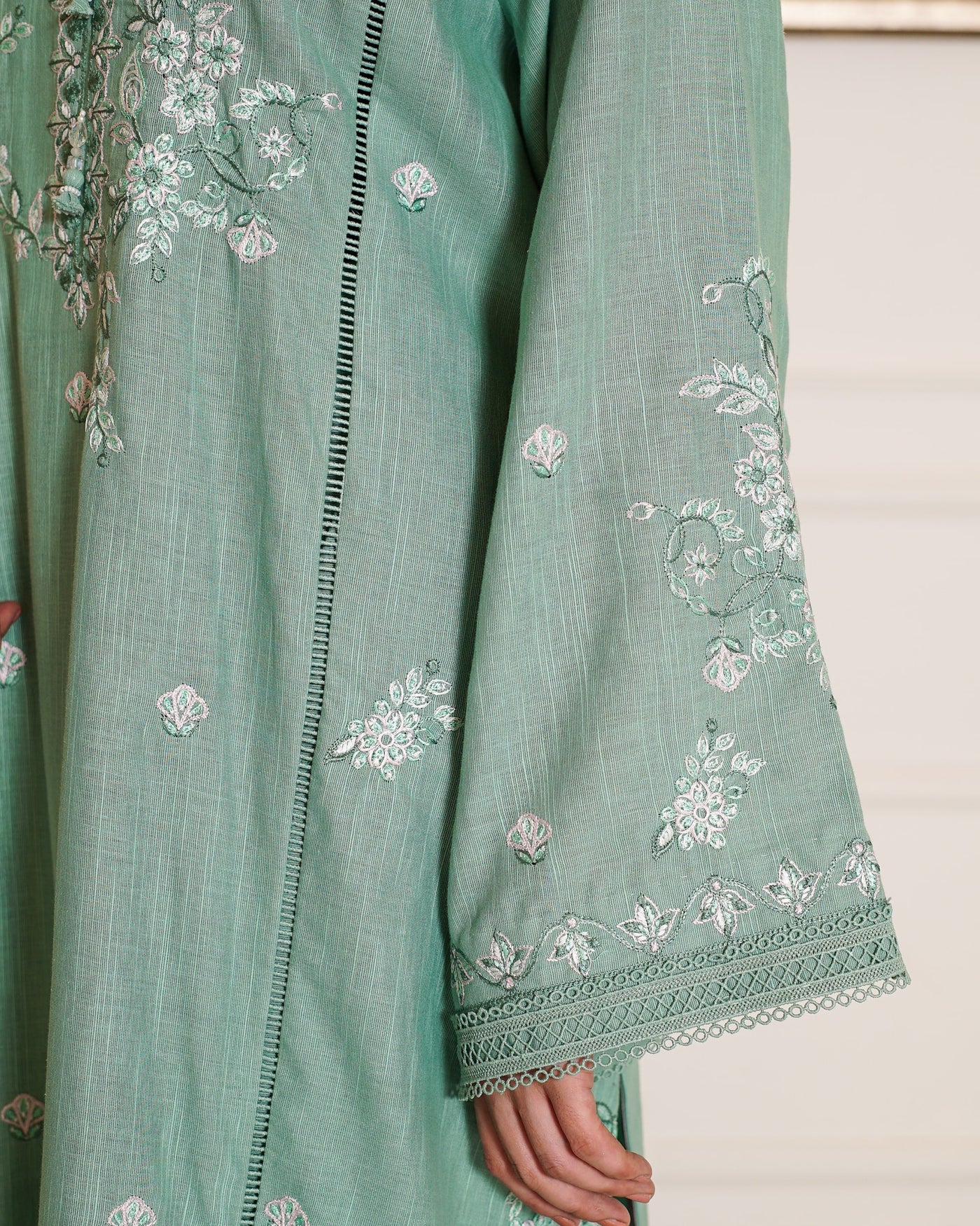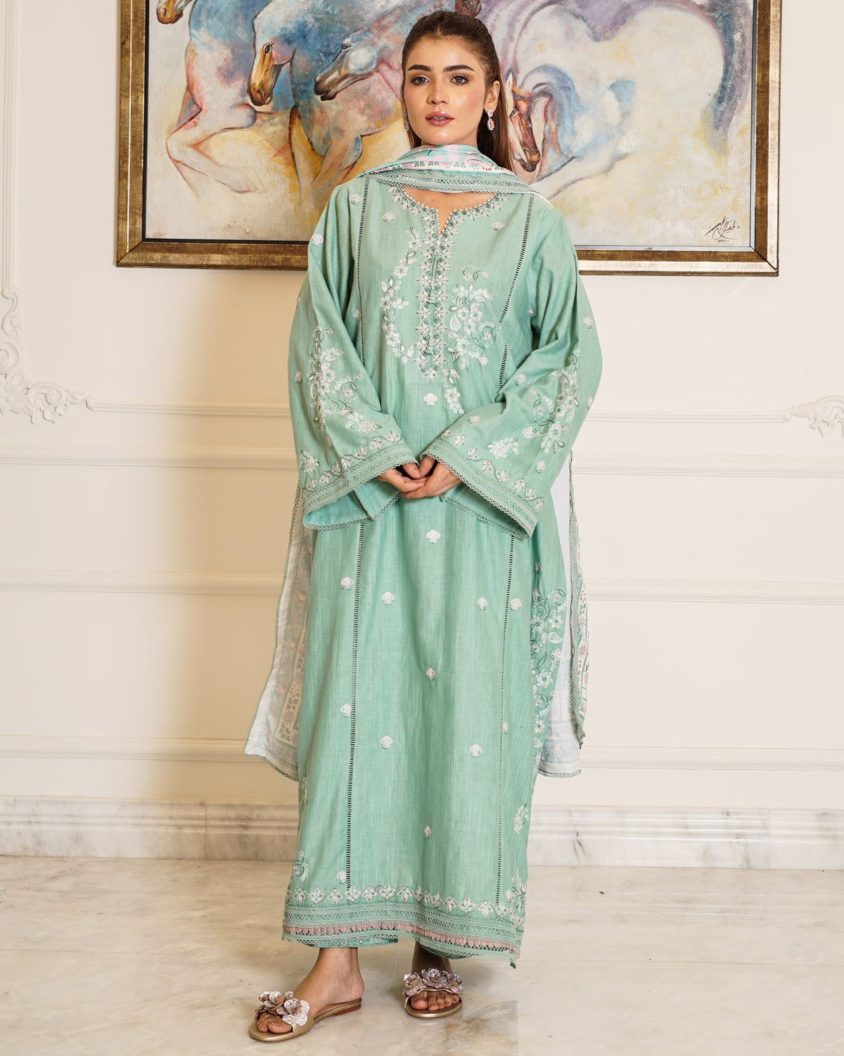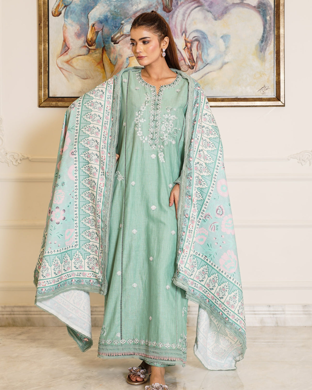 This soft sage green khaddar outfit is delicately adorned with embroidery in soothing shades of green, pink, and off-white. The shirt features an embroidered neckline that adds elegance, while finely crafted borders highlight the ghera for a graceful flow. Coordinating embroidered borders for the trousers complete the refined look, giving the ensemble a cohesive and polished finish. Paired with a printed wool shawl, this outfit blends gentle colors with intricate detailing — a perfect balance of comfort and sophistication for the winter season.